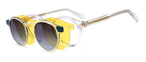 occhiale pantoscopico calibro 47 in acetato con una clip cerchiata e una gialla